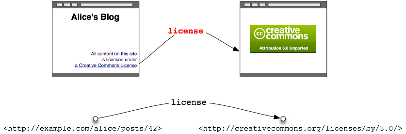A human clearly understands this sentence, in particular the meaning of the link with respect to the current document: it indicates the document's license, the conditions under which the page's contents are distributed. Unfortunately, when Bob visits Alice's blog, his browser sees only a plain link that could just as well point to one of Alice's friends or to her resume. For Bob's browser to understand that this link actually points to the document's licensing terms, Alice needs to add some flavor, some indication of what kind of link this is.