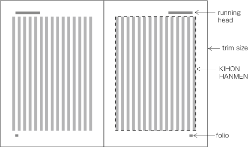 The appearance of Running Heads and Folios and their positions relative to the trim size and KIHONHANMEN