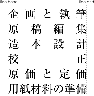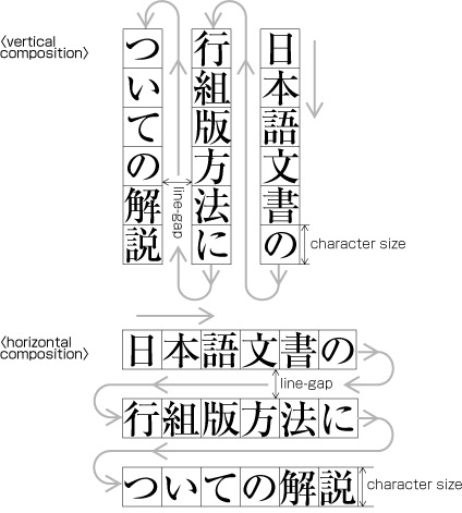 KANJI and KANA characters for Japanese text layout have basically been designed to have the same dimensions of a square body, and the same collection of types can be used in either vertical composition or horizontal composition simply by changing the direction of text. (See Fig. 1-13). There were some attempts to develop Printing types designed exclusively for horizontal composition, but they were not widely accepted.