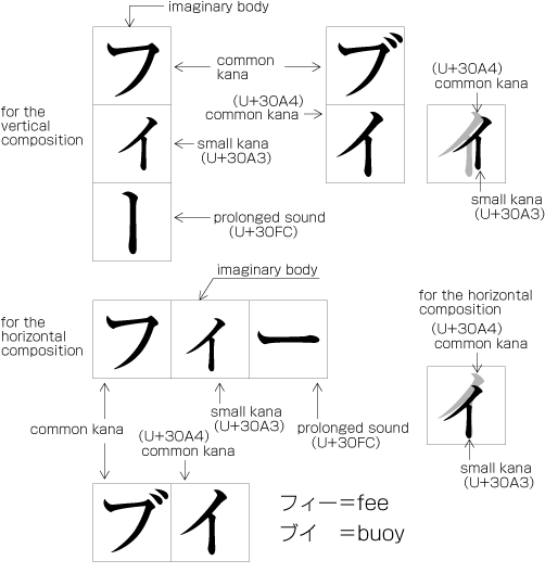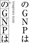 The letter face of Small KANA (っ, ょ, ュ, ァ, ィ, ゥ, etc) shall be placed at the vertical center and to the right of horizontal center of the imaginary body in vertical composition, and at the horizontal center and below the vertical center in horizontal composition. (See Fig. 1-7). Also there are punctuation marks of which letter faces are not placed at the vertical and horizontal center of the imaginary body.