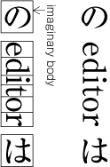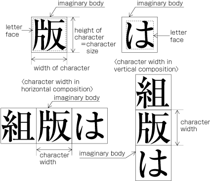 KANJI and KANA characters that are of the same size have square Imaginary bodies of equal dimensions (also known as the outer frame of a character). Aligned with the vertical and horizontal center of the imaginary body, there is a smaller box called the Letter face which contains the actual symbol. Character size shall be measured by the size of the imaginary body (See Fig. 1-6). "Character width" is a term to describe the advance width of the imaginary body of a character in text direction (Direction of text advance). By definition it is equal to the "width" of a character in horizontal composition, while it's the height of a character in vertical composition (See Fig. 1-6).