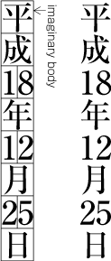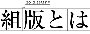 When composing a line with KANJI and KANA characters, in principle no extra space between their imaginary bodies is placed. This is called Solid setting (See Fig. 1-8).