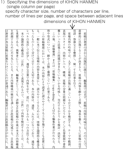 In horizontal setting with two columns, if at all possible, the width of illustrations should be either the width of one column (which is provided via KIHONHANMEN) or the width of KIHONHANMEN (see Fig. A1-2). The position of illustrations is often the head or the Foot of the page (see Fig. A1-2).