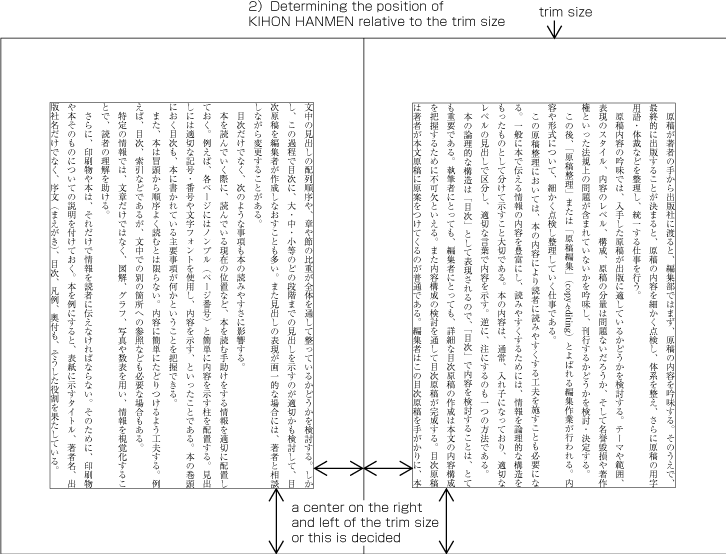 In Japanese layout, first the size of KIHONHANMEN is defined, using the square imaginary body of characters in solid setting. Taken this as a base, the position of KIHONHANMEN with regards to the trim size is specified. Now, the following are procedures to determine KIHONHANMEN (See Fig. 1-26).