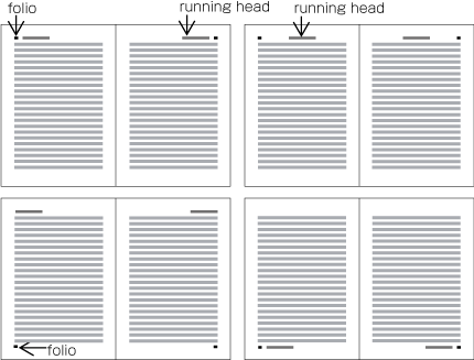 There are two methods to arrange running heads (Arrangement of running heads is defined in JIS X 4051, sec. 7.6.2. Folios are defined in sec. 7.5.2.).