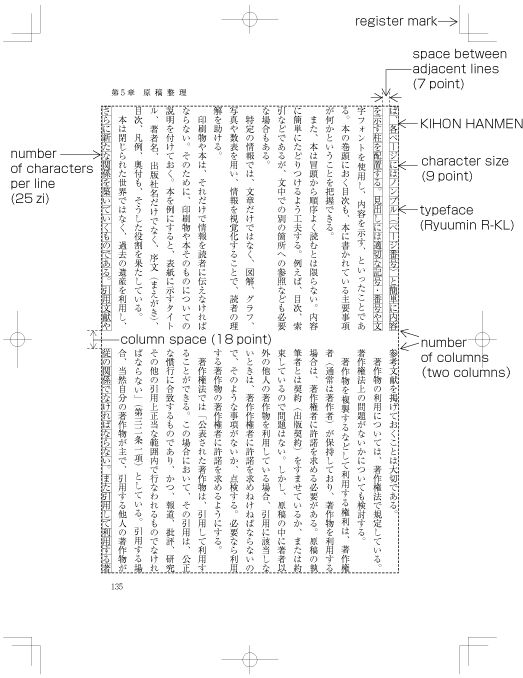 The question of how the various elements of KIHONHANMEN are applied to a real page is an important aspect for the understanding of the characteristics of Japanese type setting. Accordingly, the details of KIHONHANMEN will be explained later. |