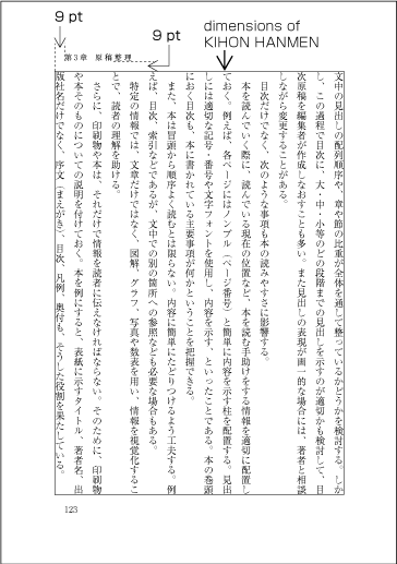 Design (including running head and folios) and type setting examples for KIHONHANMEN in different paper sizes are available in JIS X 4051, annex 3 and 4. |