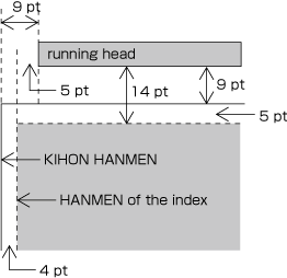 Positioning a running head above the top left corner ( to Head and Fore-edge) of KIHONHANMEN in vertical composition (See Fig. 1-30) 9 points above KIHONHANMEN (vertical space) 9 points from the left edge of KIHONHANMEN (horizontal space) |