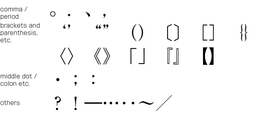 In addition to KANJI and KANA, various punctuation marks (See Fig. 1-5) as well as Arabic numerals, Latin characters and/or Greek characters may be used in Japanese text.