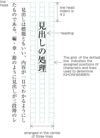 The space of line feed direction of headings is specified by using the line positions provided by KIHONHANMEN as a basis and by deciding how many times they need to be used. (Details of this processing are defined in JIS X 4051, sec. 8.3.3. d). The Indentation of the text direction of the heading is normally specified by using the character position designed via KIHONHANMEN as a basis. The indentation is then several times of that position. In the example in Figure A1-1, the heading is placed in the middle line of three lines which are provided via KIHONHANMEN. It is indented 4 characters of the character size provided via KIHONHANMEN.