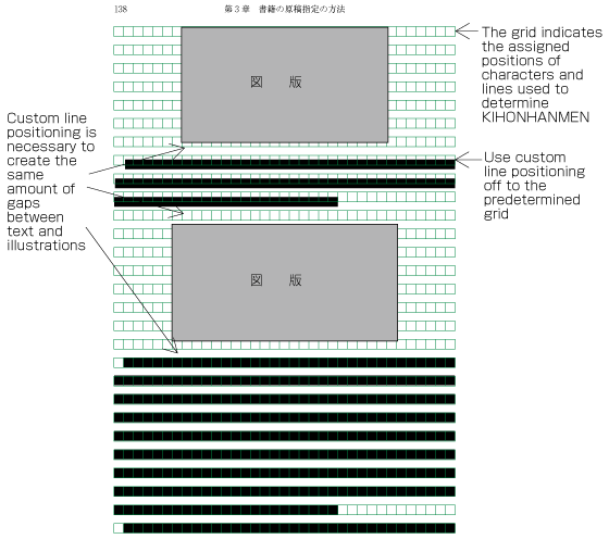 Use the same amount of line-gap across the book except special cases and each line should be aligned. With these two conditions, the size of KIHONHANMEN in the line feed direction is specified with number of lines and line-gap (or line height, GYO-OKURI).