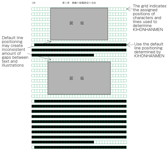 In horizontal composition, assuming that there is no text to the left or right of an illustration or table, it can happen that when inserting more than one illustration or table, they slip of the lines given via KIHONHANMEN (see Fig. A1-10). But the illustration or table may also rely on the lines given via KIHONHANMEN (see Fig. A1-11). The former method is used to achieve equal space before and after illustrations or tables, if at all possible (This method is often used in books.). This processing method is defined in JIS X 4051, sec. 10.3.2., d).