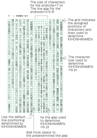 Notes which are inserted between paragraphs or at the bottom of the page (in horizontal composition) are smaller than the character size given via KIHONHANMEN. As a result, the line distance becomes smaller, and the line positions are not identical to the lines given via KIHONHANMEN. As an example, Figure A1-12 shows the position of an endnote between paragraphs in vertical composition. The processing of endnotes is defined in JIS X 4051, sec. 9.3, and the processing of footnotes in sec. 9.4.