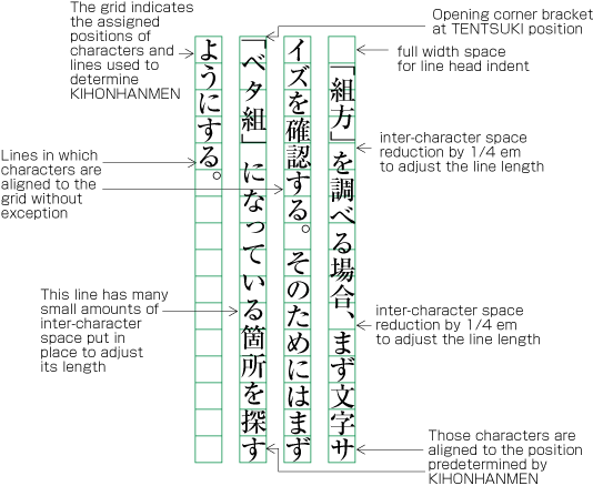 There are several methods for positioning brackets at the head of line feed lines or lines after the first line of a paragraph (details are explained in sec. 2.1.5 "Positioning of Brackets at Line Head".). In cases where the indentation of line feed lines is full width, or if the TENTSUKI position is used for the bracket (that is, there is no space at the line head), the second character will be in a position which is not given via KIHONHANMEN (see Fig. A1-14). However, since adaptation processing for the unification of line lengths is applied, the characters at the end of the line are at positions which are in accordance with the positions given via KIHONHANMEN.