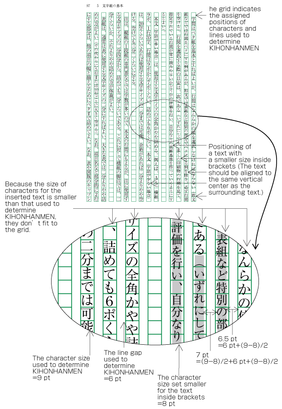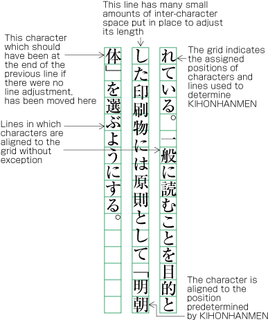 In principle, pagewise positioning of lines relies on the line positions given via KIHONHANMEN. This is also true for RUBY or KENTEN like in Figure A1-5, and also with characters as shown in Figure A1-9. These characters within a line are smaller than the characters size provided by KIHONHANMEN. Nevertheless, the line positions given by KIHONHANMEN is taken as a base, and the subsequent lines also use these positions.