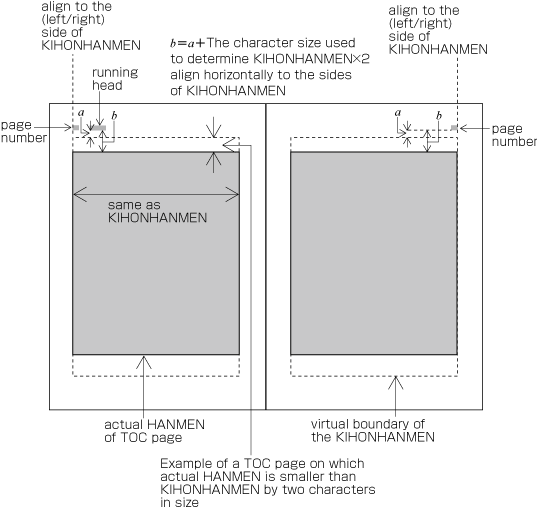 Figure A1-17 Positioning of running heads and folios on TOC pages on which HANMEN is smaller than KIHONHANMEN in size.