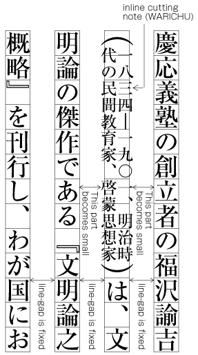 WARICHU juts out of the width of the line feed direction (the character size designed via KIHONHANMEN). Also for these cases, the inter-line spacing is defined for the parts without WARICHU, and the passages with WARICHU are made narrower (see Fig. A1-18). Hence, for WARICHU, inter-line spacing is larger to some extend. The same is true for TATECHUYOKO or sub- and superscript. Further explanations of the placement of WARICHU and other items is provided in sec. 2.