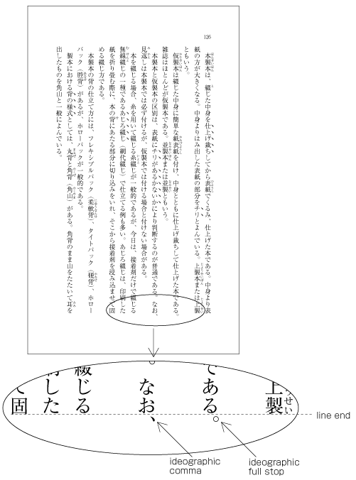 If there is RUBY, BOSEN, KENTEN etc. at the right side (for vertical setting) or upper side (for horizontal setting) of the HANMEN or the first paragraph of a page, the added item is put outside the HANMEN or the area of the paragraph (see Fig. A1-6). In cases where RUBY, under lines etc. are put on the left (in vertical setting) or bottom (horizontal composition), the item is in contact with the HANMEN or the line at the end of the paragraph. Like for the handling of exceptions mentioned below, the purpose here is to preserve the line positions which are provided via KIHONHANMEN. It is also possible to insert references to notes between lines within the main text. This case is handled in the same manner.