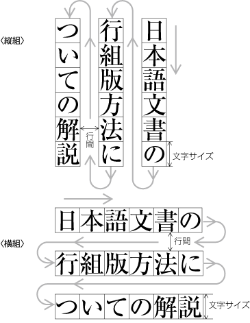 日本語組版に使用する漢字と仮名は,原則として正方形の文字なので,活字組版の時代から,縦組・横組共用の印刷用文字の配置方向を変えるだけで,縦組と横組の組版が可能であった(図1-13参照).なお,横組専用の活字の設計も一部で行われた例があるが,あまり普及しなかった.