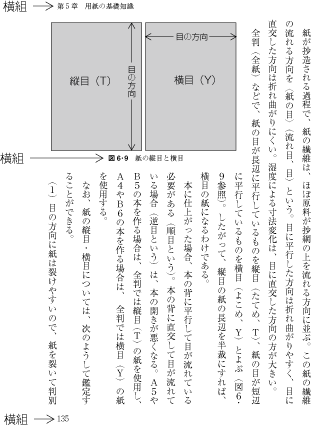 1つの印刷物の中では,縦組と横組のどちらか一方の組方向で組版するが,縦組の場合は,横組にして柱を配置するなどして,部分的に横組が混用される場合も多い(図1-14参照). 例 ページ内に配置する表及びキャプション,図版のキャプション,柱,ノンブルなど.