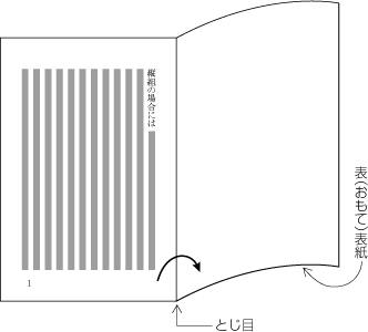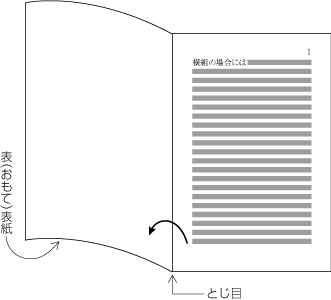 段は上から下に,ページは表面から開始,右から左に配置する(左方向から右方向に本は開いていく,図1-16参照).
