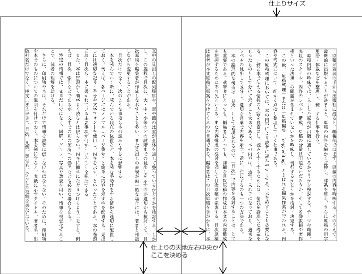 一般には,基本版面を仕上りサイズの天地左右中央に配置する例が多い.つまり,デフォルトは仕上りサイズの天地左右中央であり,基本版面のサイズによっては,天地中央よりやや上げる・下げる,または左右に移動させるなどの操作を行う. |