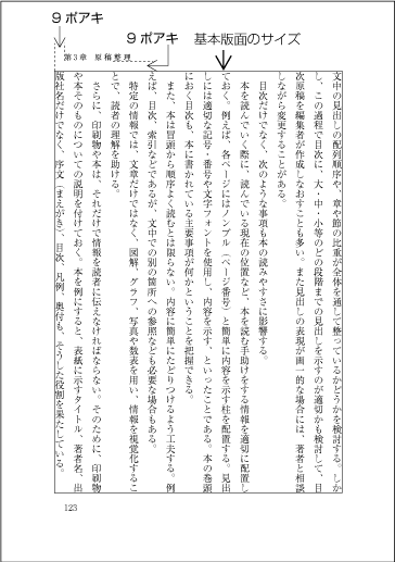 基本版面で設計した各要素が,実際のページでどのように適用されるかは日本語組版の特徴を理解するための重要なポイントである.そこで,その詳細は後述する. |
