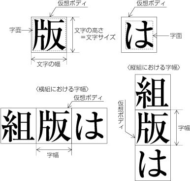 漢字と仮名は,正方形の仮想ボディ(又は文字の外枠ともいう)をもっており,その仮想ボディの天地左右中央に,仮想ボディよりやや小さくした字面をもっている.文字サイズは,この仮想ボディのサイズで示す(図1-6参照).なお,字幅は,文字を配列する方向(字詰め方向)の仮想ボディの大きさをいい,横組では文字の幅となるが,縦組では文字の高さとなる.(図1-6参照)