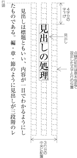 見出しの行送り方向のスペースは,基本版面で設定した行の位置を元に,それの何行分を用いるかという方法で設計する(この処理方法については,JIS X 4051の8.3.3のd)に規定されている).見出しの字詰め方向の字下げは,基本版面で設定した文字位置を基準に,その何字分を下げるかという方法で一般に設計する.図追1-1の例は,見出しを基本版面で設定した行の位置の3行の中央に配置し,基本版面で設定した文字サイズの4字下がった位置に配置している.