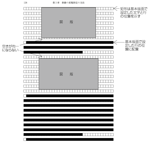 見出しは,前述したように必ずしも基本版面で設定した行の位置とは揃わないことがある.しかし,その行送り方向にしめる領域は,基本版面で設定した行を基準に設計する(図追1-1参照).