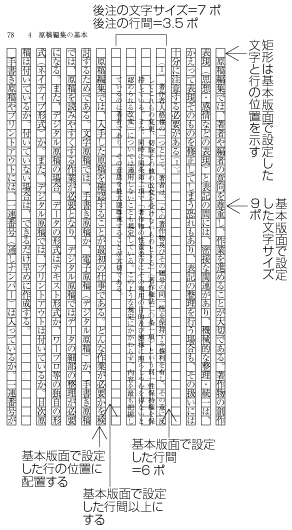 段落間や横組でページの下端に挿入される脚注などは,基本版面で設定した文字サイズよりは小さくする.これに伴い行間も狭くするので,基本版面で設定した行の位置とは揃わない.例えば,縦組において,段落の間に入る後注の配置位置の例を図追1-12に示す.後注の組版処理については,JIS X 4051の9.3,脚注は9.4に規定されている.