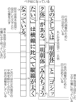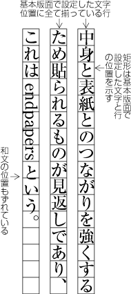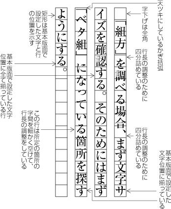 各行に配置する文字の位置は,基本版面で設定したベタ組とした文字の配置位置に従うのが原則である.しかし,前掲したいくつかの図でも基本版面で設定した文字の位置に従っていない例がある.こうした事例は多いが,以下では,典型的な例をいくつか示す(詳細は第2章で解説する).