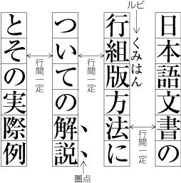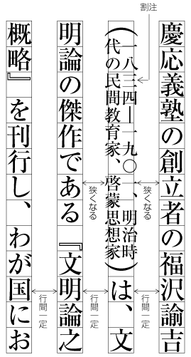 古典の注釈本などで,行間にルビやその他の要素を数多く配置する場合などを除き,行間を全角アキ以上にすることはない.全角アキ以上にしたからといって,読みやすくなるわけではない. |