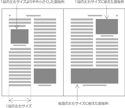 横組の2段組に図版を配置する場合,図版の左右サイズは,できるだけ基本版面で設計した1段の左右サイズ又は基本版面の左右サイズを基準に設計し,そのいずれかのサイズで配置できるときは,そのように決める(図追1-2参照).また,位置は,多くは版面の天又は地などに揃えて配置する(図追1-2参照).