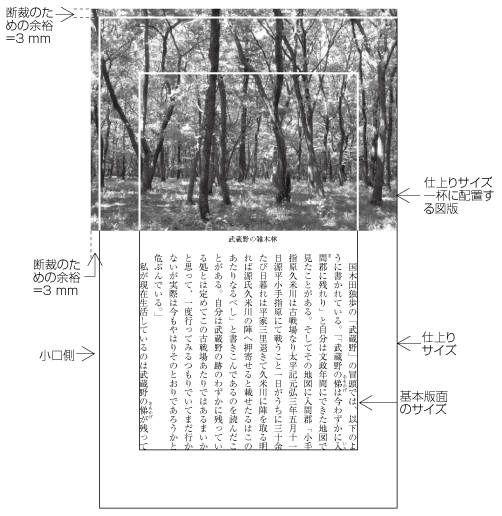 視覚的効果を出すために基本版面で設定した範囲をはみ出して配置する.特に紙面一杯に配置する“裁ち落し”とよばれる方法は,書籍では多くないが,雑誌などではよく行われている(図追1-8参照).