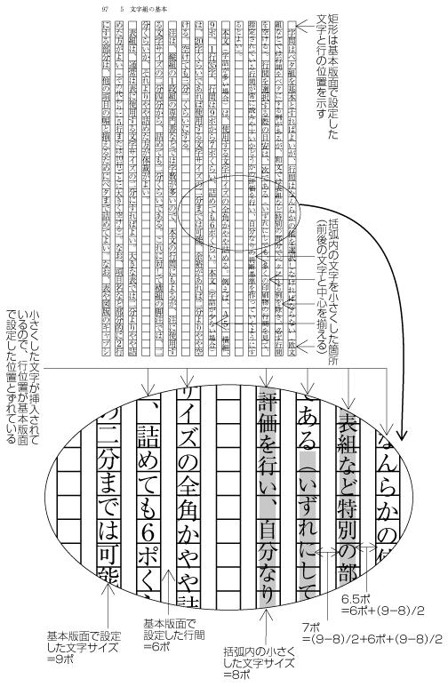 各ページにおける行の位置は,基本版面で設定した行の位置に従うのが原則である.前掲した図(図追1-5)のようにルビや圏点が付いた場合だけでなく,例えば,次の図追1-9に示したように,行中の一部として基本版面で設定した文字サイズより小さな文字が入る場合でも,基本版面で設定した行の位置を基準に配置し,それに後続する行も基本版面で設定した行の位置にくるようにする.