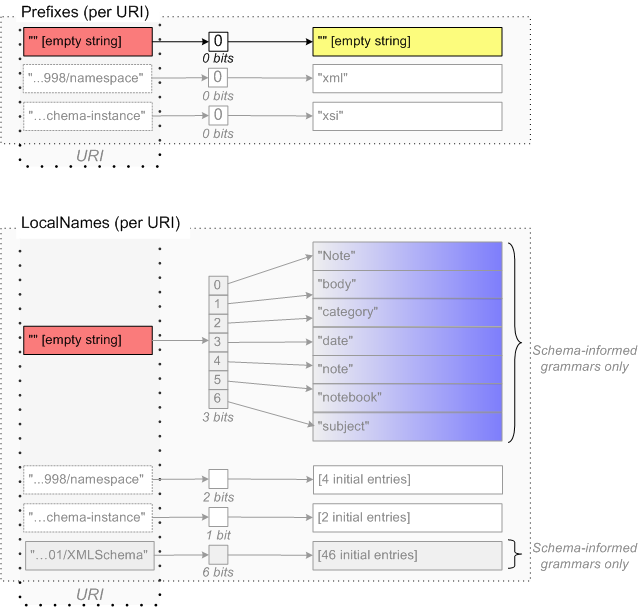 For named XML items, such as elements and attributes, there are three types of events: SE(qname), SE(uri:*) and SE(*) as well as AT(qname), AT(uri:*) and AT(*). These events differ in their associated structure: when SE(qname) or AT(qname) are used, the actual qname of the XML item is not encoded as part of the event while SE(uri:*) and AT(uri:*) events do not encode the uri. The decision to use one type of event over the other will be explained later after introducing the notion of EXI grammars. Additionally, Fidelity Options may allow the preservation of namespace prefixes.