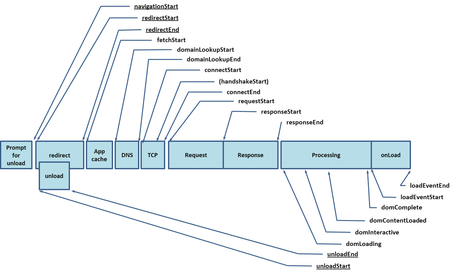 The following graph illustrates the timing attributes defined by the PerformanceTiming interface and the PerformanceNavigation interface with or without redirect, respectively. Attributes underlined are only available when the previous document and the current document are from the same origin. User agents may perform internal processing in between timings, which allow for non-normative intervals between timings.