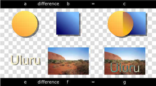 The resultant color is the absolute difference between the source and destination colors. The destination color is inverted when white is used. The destination color is preserved when black is used.