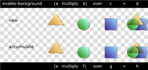 For container elements with an ‘enable-background’ set to accumulate, the compositing operation used to place the group image onto the background (canvas) is modified. The operation will apply any reduction to the background caused by the objects.