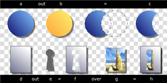 Graphics elements are composited onto the elements already rendered on the canvas based on an extended Porter-Duff compositing model, in which the resulting color and opacity at any given pixel on the canvas depend on the ‘comp-op’ specified. The base set of 12 Porter-Duff operations shown below always result in a value between zero and one, and as such, no clamping of output values is required.