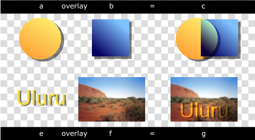 Compositing involving the alpha channel is referred to alpha compositing. By default SVG Full 1.1 [SVG11] and SVG Tiny 1.2 [SVGT12] both use Simple Alpha Compositing that gives a resultant effect of overlaying the object on to the background. If the overlayed object contains transparency, the color of the background may show through the overlayed object.