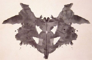 Context: An image on a page explaining in general terms Rorschach inkblot personality tests. The image is an abstract free form which is subjective to individual interpretation.