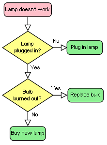 <p>A flowchart representing a process for dealing with a non-functioning lamp:</p> <p><img src="flowchart.gif" alt="If the lamp doesn't work; check if it's plugged in. If not, plug it in. If it's plugged in and still doesn't work; check if the bulb is burned out. If it is, replace the bulb. If it still does not work; buy a new lamp."></p>