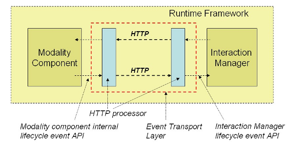 The "Multimodal Architecture and Interfaces" specification supports deployments in a variety of topologies, either distributed or co-located. In case of a distributed deployment, a protocol for the lifecycle event transport needs to be defined. HTTP is the major protocol of the web. HTTP is widely adopted, it is supported by many programming languages and especially used by web browsers. Technologies like AJAX provide asynchronous transmission of messages for web browsers and allow to build modality components on top of it in distributed environments. This section describes how the HTTP protocol should be used for MMI lifecycle event transport in distributed deployments. Modality components and the Interaction Manager need an HTTP processor to send and receive MMI lifecycle events. The following picture illustrates a possible modularization of the Runtime Framework, the Interaction Manager and the Modality Components. It shows internal lifecycle event interfaces (which abstract from the transport layer) and the HTTP processors. The HTTP processors are responsible for assembling and disassembling of HTTP requests, which carry MMI lifecycle event representations as payloads.