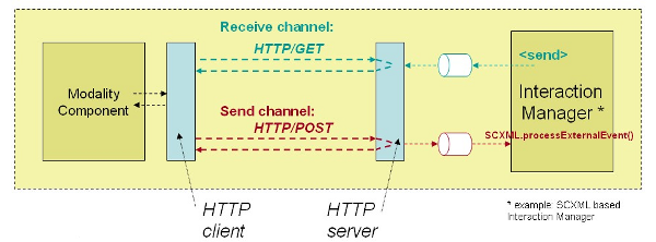 In this deployment scenario the Interaction Manager acts as an HTTP server, whereas modality components are HTTP clients, sending HTTP requests to the Interaction Manager. But other configurations are possible.