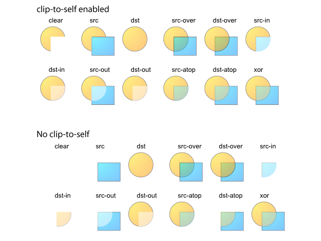 | Value: | clear | copy | destination | source-over | destination-over | source-in | destination-in | source-out | destination-out | source-atop | destination-atop | xor | lighter |
