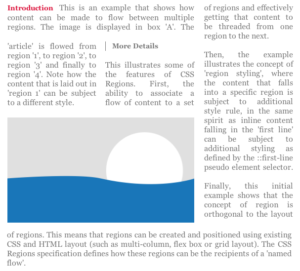 The CSS regions module allows content to flow across multiple areas called regions. The regions are not necessarily contiguous in the document order. The CSS regions module provides an advanced content flow mechanism, which can be combined with positioning schemes as defined by other CSS modules such as the Multi-Column Module [CSS3COL] or the Grid Layout Module [CSS3-GRID-LAYOUT] to position the regions where content flows.