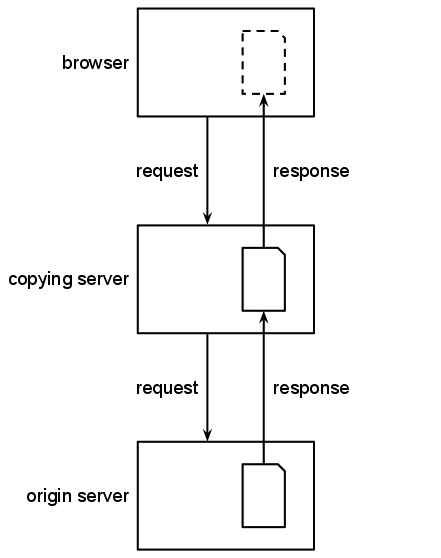 Some servers provide access to files that are hosted elsewhere on the web: on an origin server that holds the original version of the file. These files might be stored on the server and provided again at a later time (a caching proxy in this document), or might simply pass through the server in response to a request (a relaying server in this document).