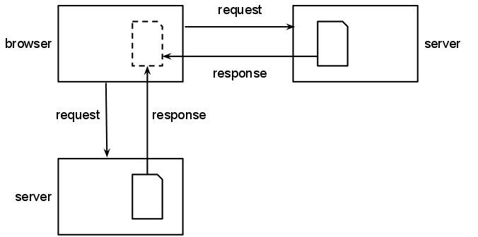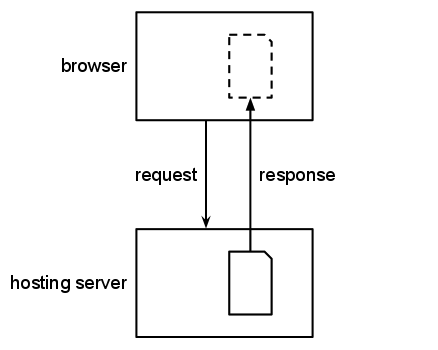 A browser makes a request to a hosting server for a file. The hosting server responds with the content of that file, which the browser stores in a local cache and displays to the user.